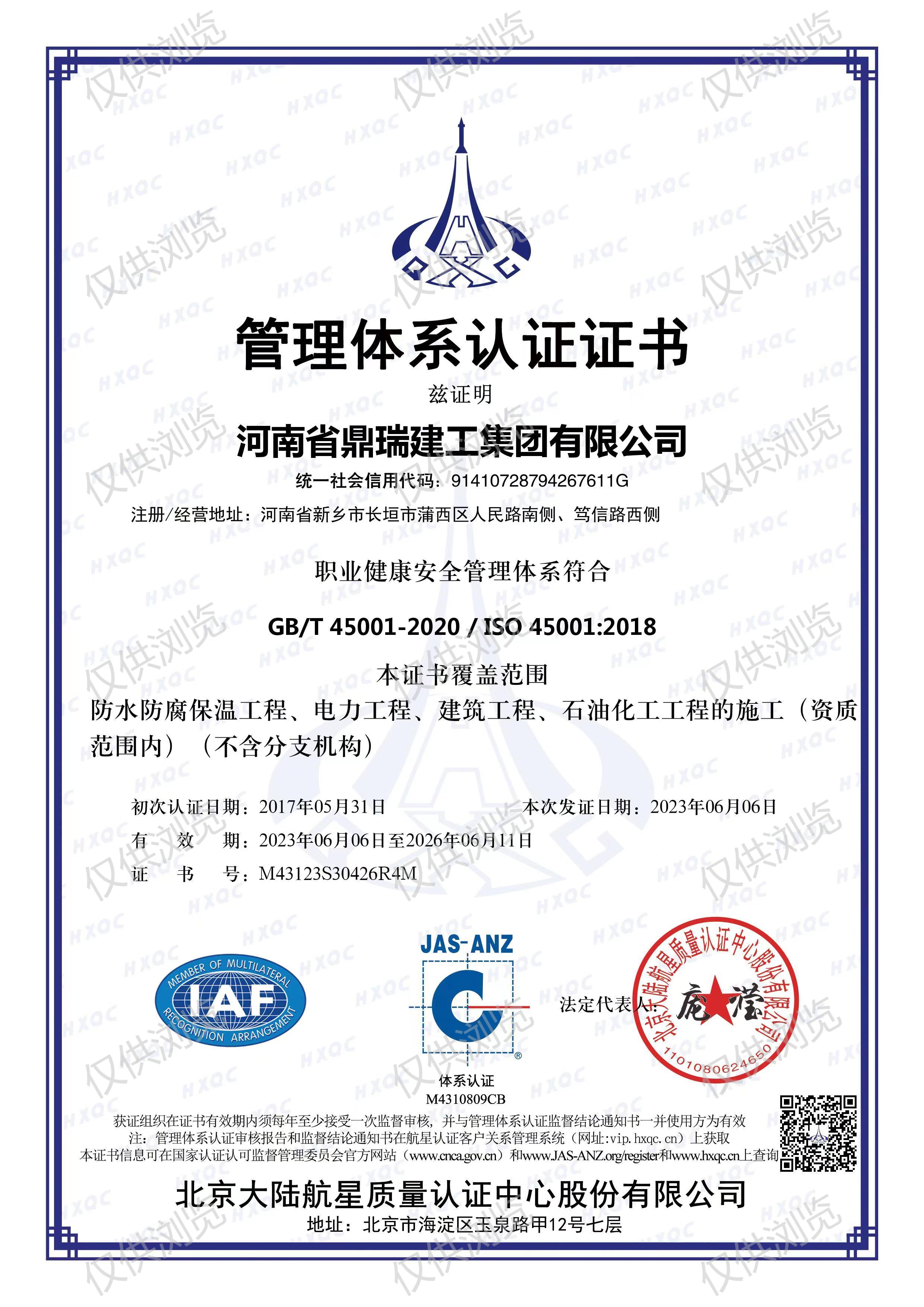 職業(yè)健康安全管理體系認(rèn)證證書